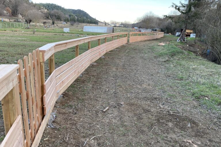 La commune de Saint-Paul-les-Durance nous confie l’aménagement des potagers communs ainsi que les clôtures d’une jeunes productrice de légumes bio en charge de fournir l’école. Une barrière en pin Douglas naturel et écologique avec un portillon pour chaque jardin offrant une balade le long de l’Abéou. » Projet en collaboration avec BK Jardinage. »